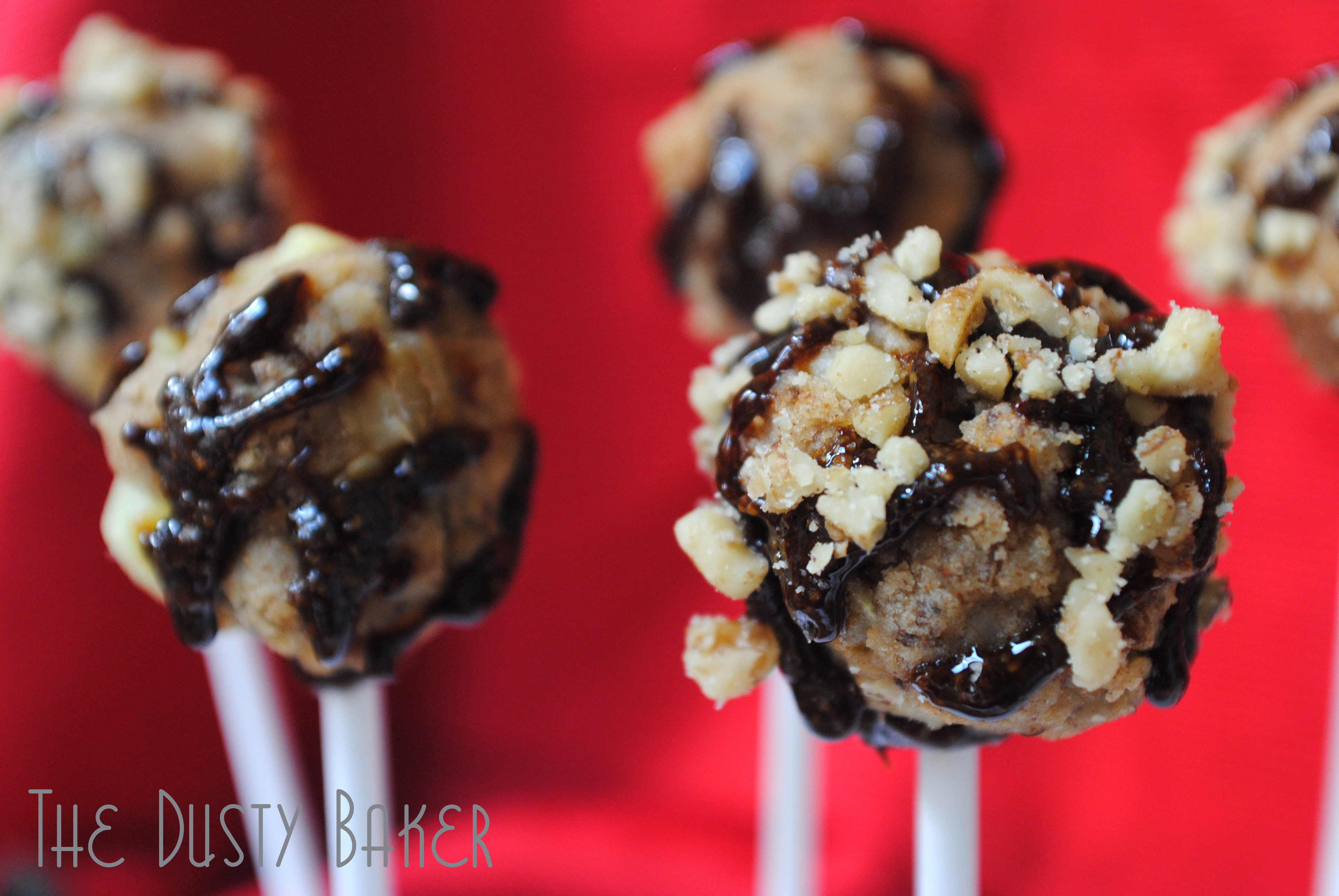 - Drizzle the cake pop with caramel and press into nuts, if desired.