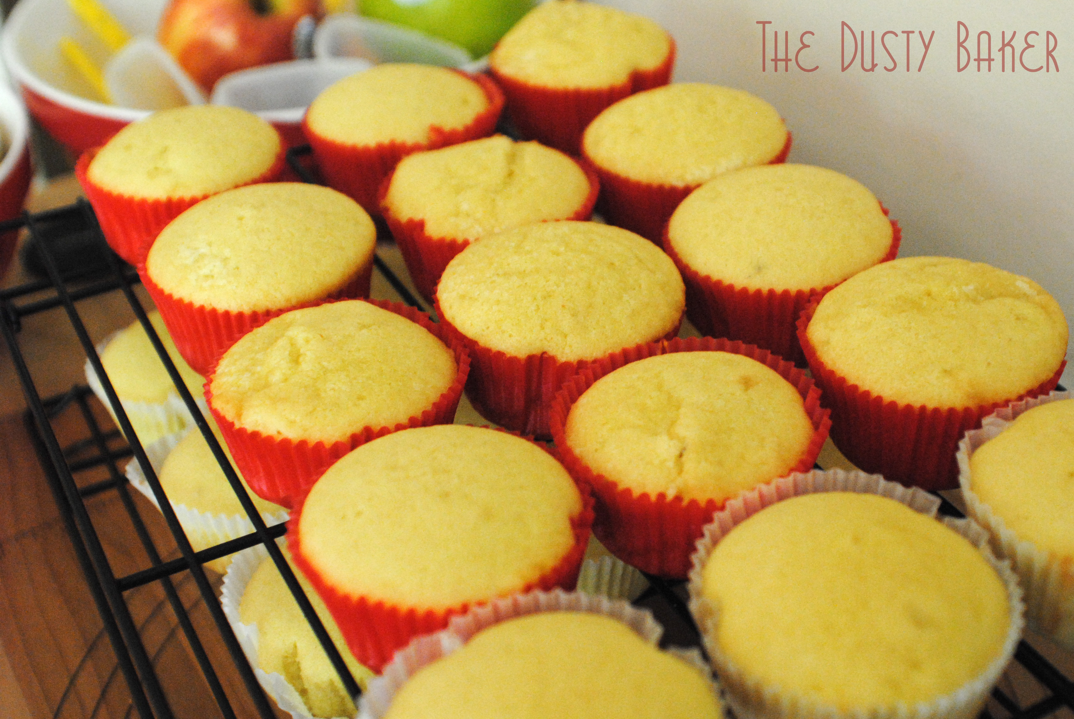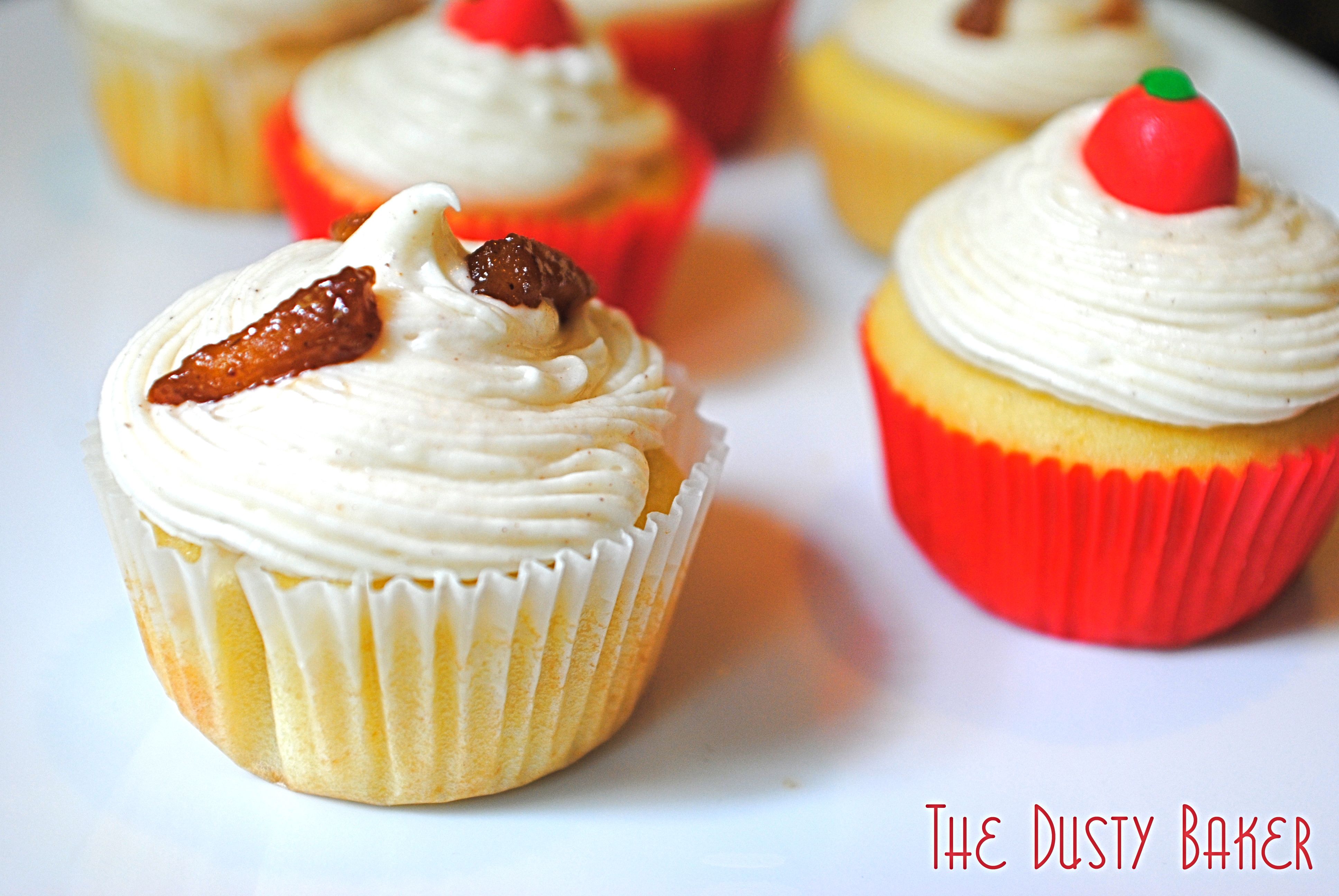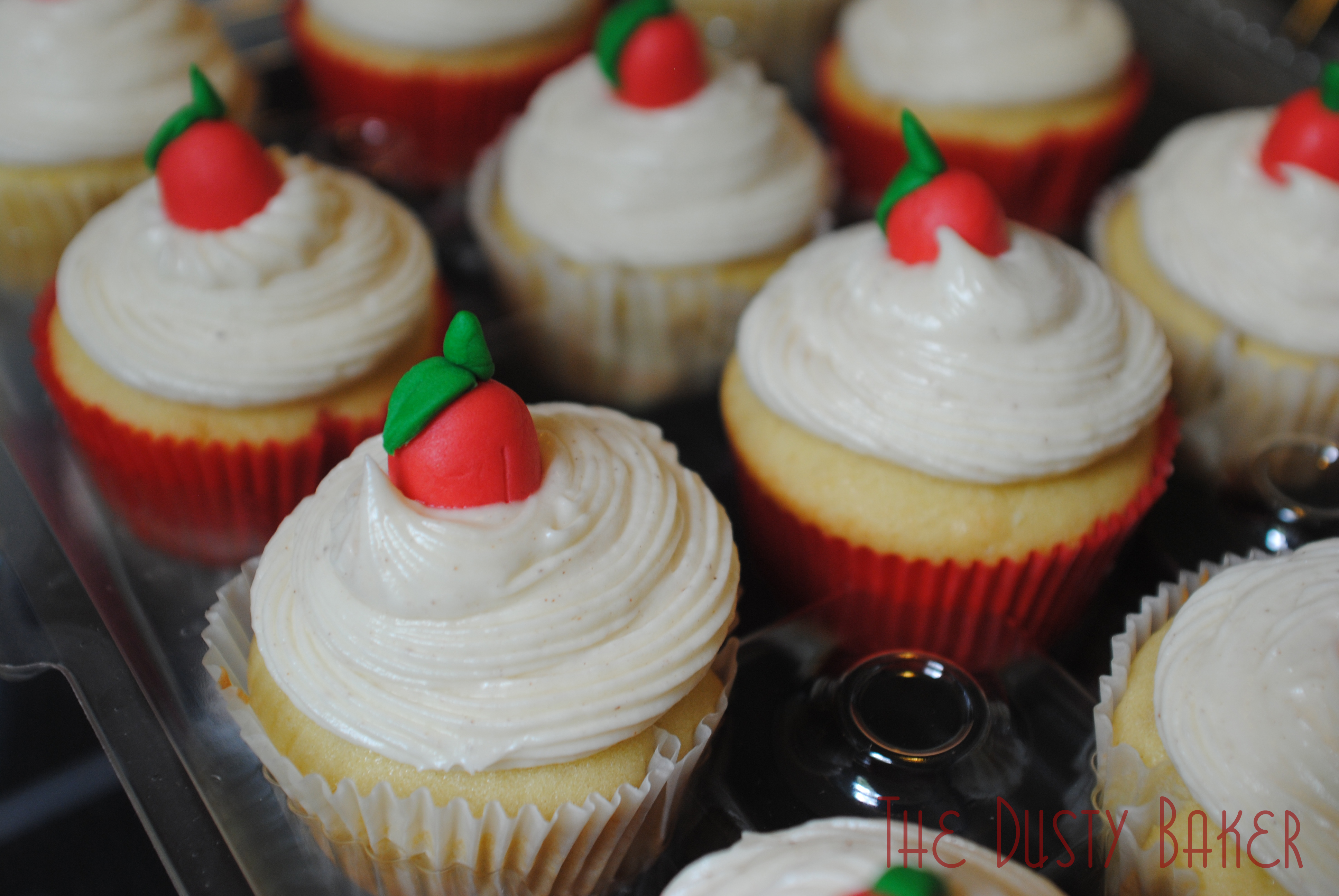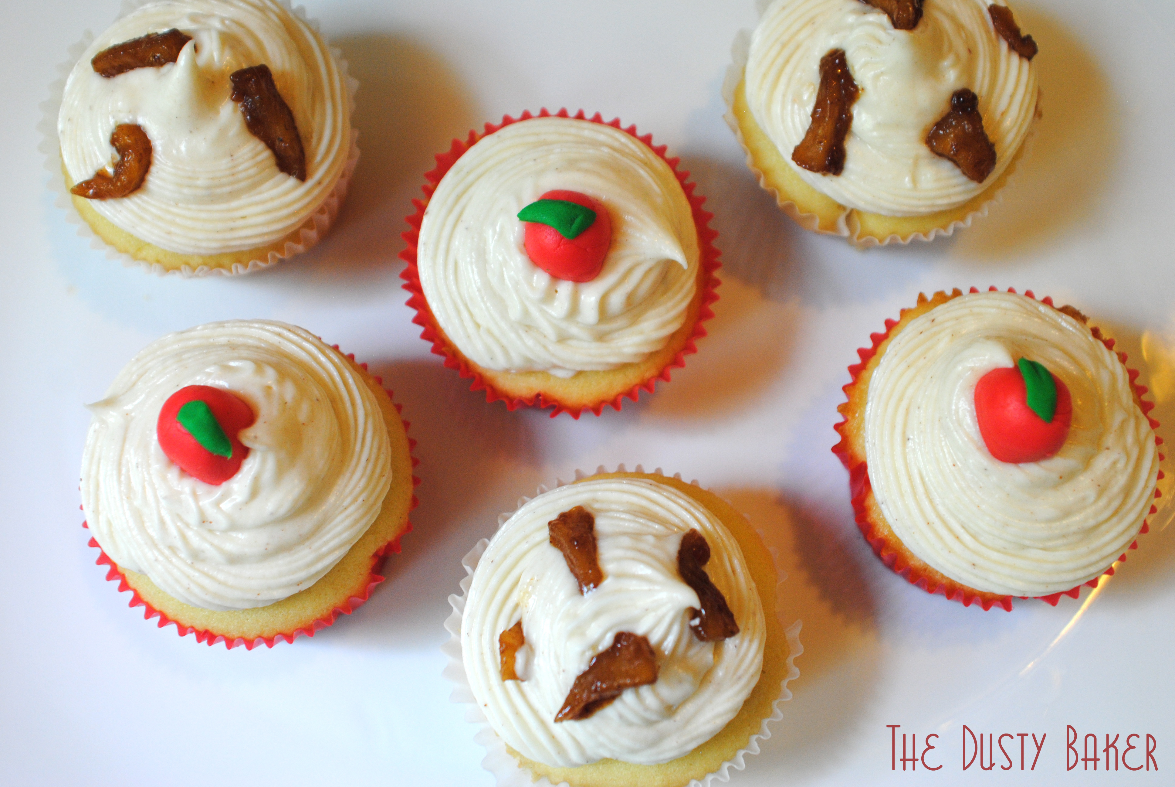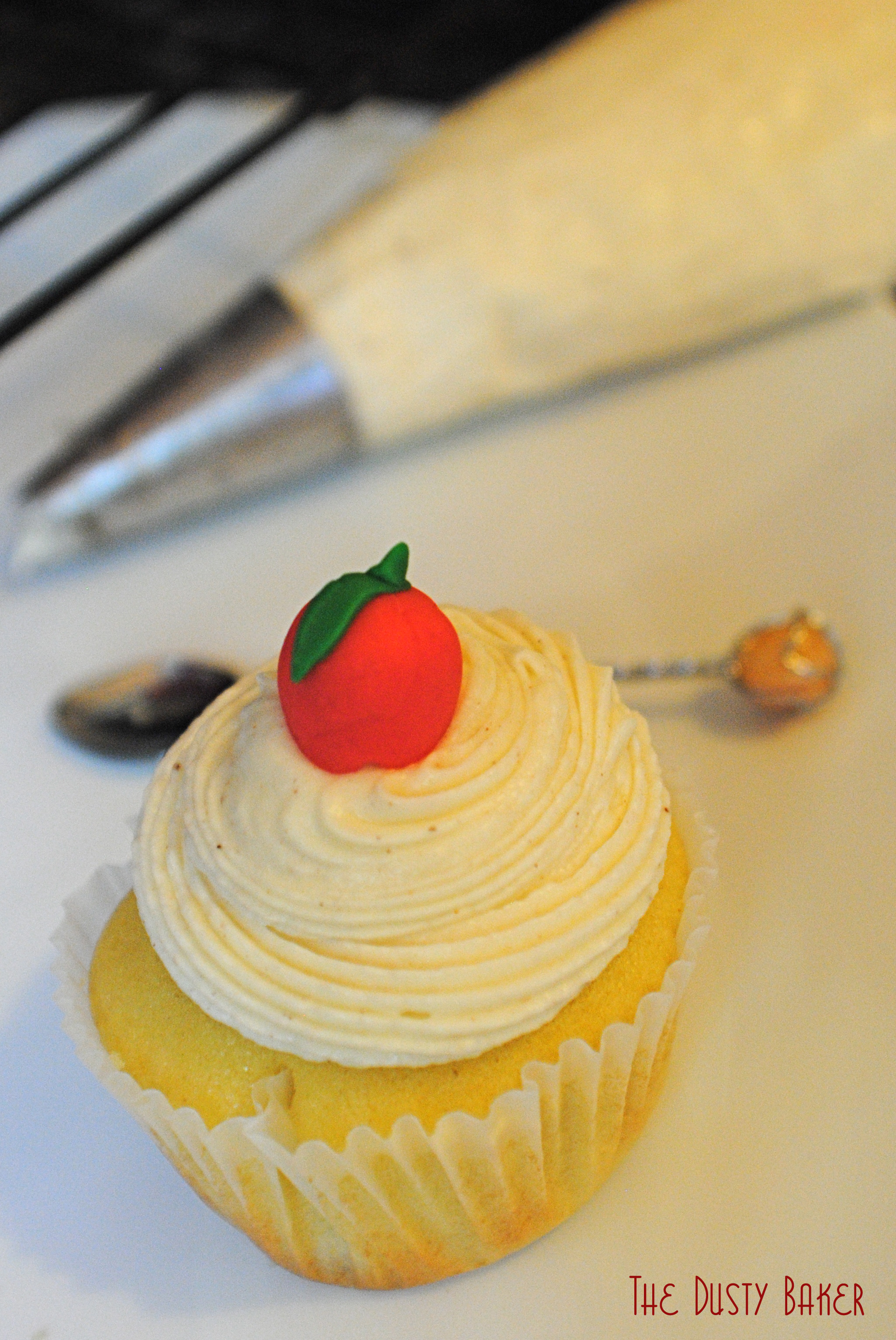 I used a tiny espresso spoon to scoop out about a teaspoon size hole in the cupcakes and filled with the cool filling. Then a swirly piping of frosting and an apple – voila!