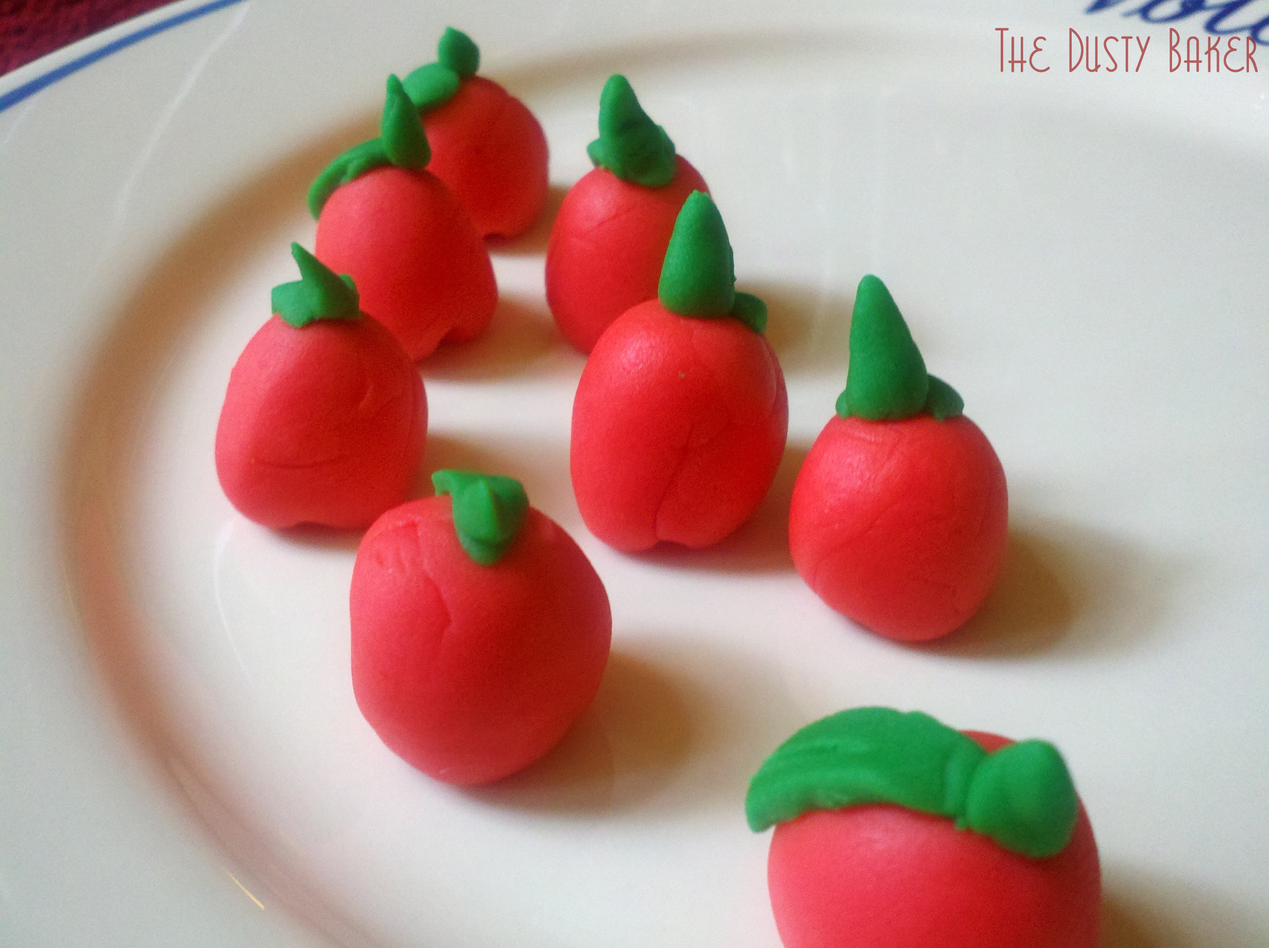 Working it with the heat of my hands kept it moist so that I could roll the red into balls, shape the bottom with a toothpick and top them with little leaves I had cut out of the green. Yes, they look like something my kindergarten self could have made – but on top of the cupcakes they made the right impression.