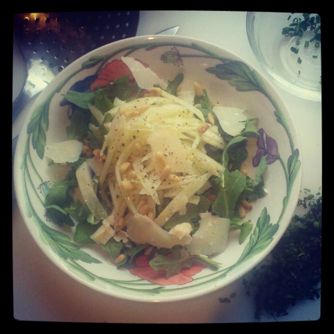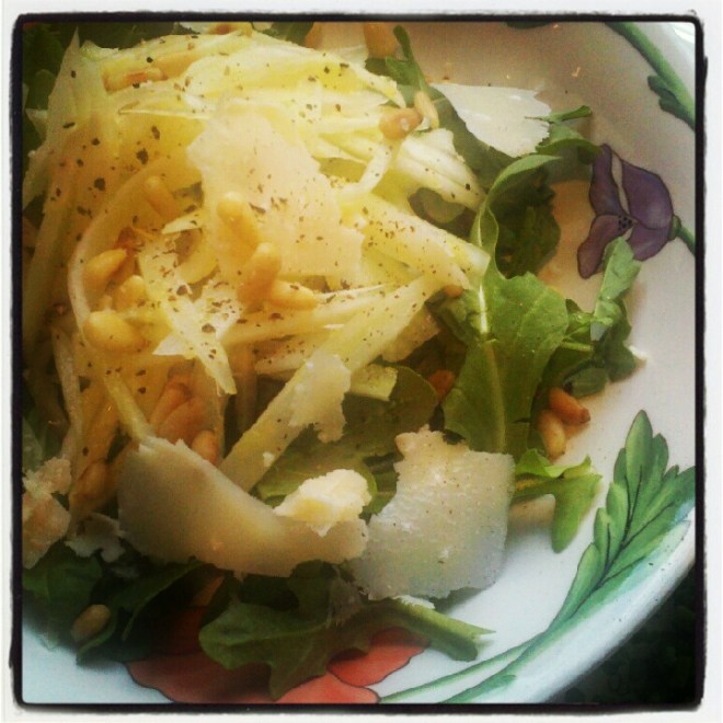 To assemble: divide arugula on four plates. Drain the juice from the fennel*. Pile equally on top of arugula. With a vegetable peeling, grate large pieces of Parmesan over each salad. Top with pine nuts and a healthy twist of black pepper.