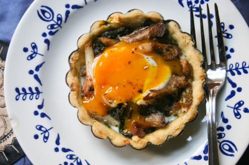Divide filling amongst tart pans. Bake for 18-20 minutes, until the edges of the tarts just slightly brown. If using eggs, very gently crack them right on top of tarts, in the center. Turn oven up to 475°, and bake another 5-7 minutes, or until the egg is set to your liking (I like my yolks soft).