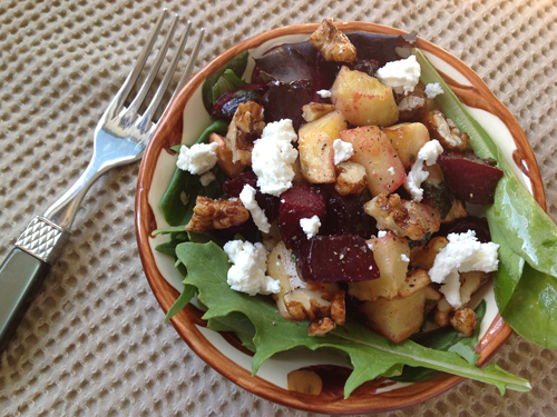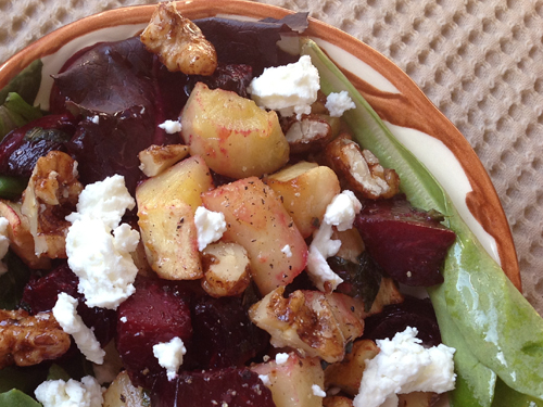 Sweet beets and parsnips combine with spiced walnuts, fresh mint and smooth goat cheese.